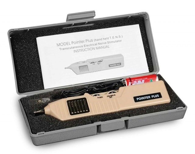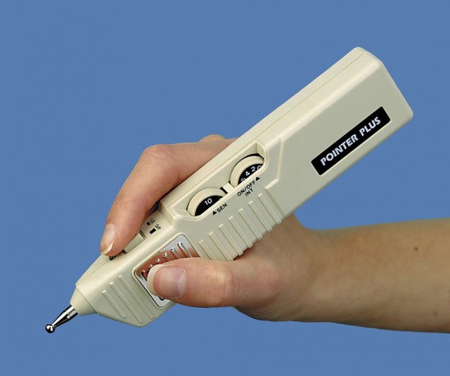 Reliable, solid, and ergonomically designed. This handheld 160 mm unit offers sensitive acupuncture or trigger point location and stimulation. The spring-activated detection probe allows even pressure during searching. Using the sensitivity wheel allows adjustment for dry or moist skin and improves differentiation between closely spaced points. A flashing light and sound indicate when point detection is achieved. The grounding circuit is created by holding the metal plate on the side of the device or by using the hand grounding rod. Pressing the button near the probe provides stimulation. The stimulation intensity is controlled by the rear dial. Pulse frequency is 10 Hz. Accessories include two probe tips (ear, 2 mm and body, 4 mm), hand grounding rod with attached cable, 9-volt battery, carrying case, and instructions. CE197. CE approved and marked.