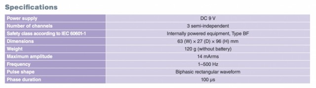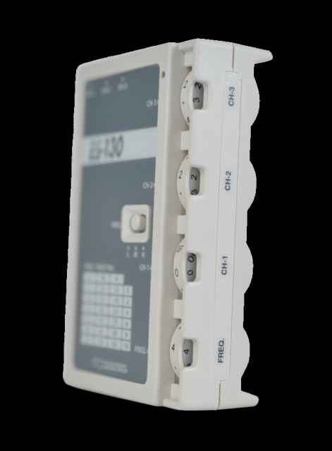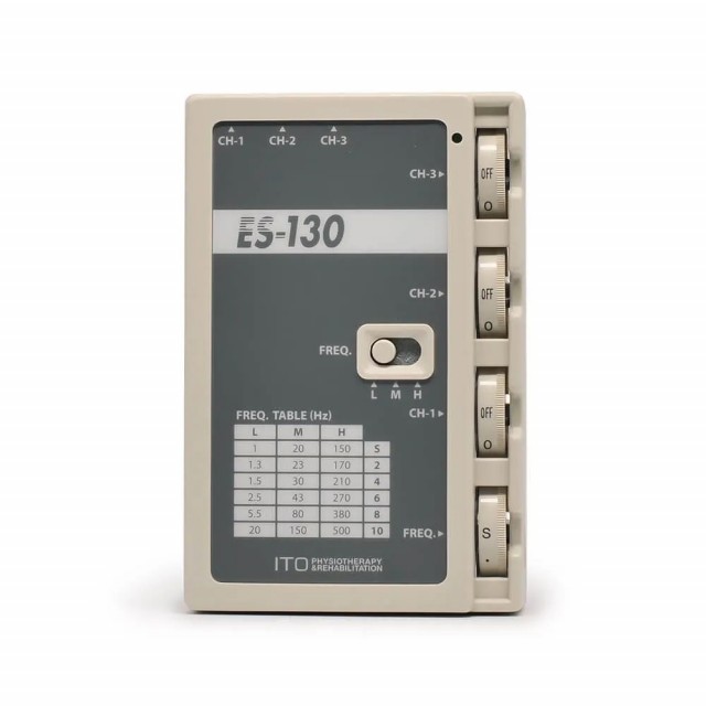 A handheld three-channel electroacupuncture device. With 3 electrostimulation channels, it makes it possible to treat different parts of the body simultaneously. Three independent channels allow you to use different current intensities for each channel. The ITO ES-130 weighs less than 150 g without batteries and, thanks to its practical compact size, is easy to take with you wherever you want. Supplied complete with cables and case. High performance and versatility. - Low/high intensity settings. - Frequency selector offers a complete frequency range (1-500 Hz). - Suitable for needles. Unique waveform. - Unique wave pulse minimizes excessive charge in the tissue and nerve damage. Safe, reliable, and easy to use. - Each of the 3 channels can be controlled independently. - Special dial controls enable easy yet safe operation. - Built-in battery life check with indicator. Frequency L - 1-20 Hz. Frequency M - 20-150 Hz. Frequency H - 150-500 Hz. CE approved and marked.